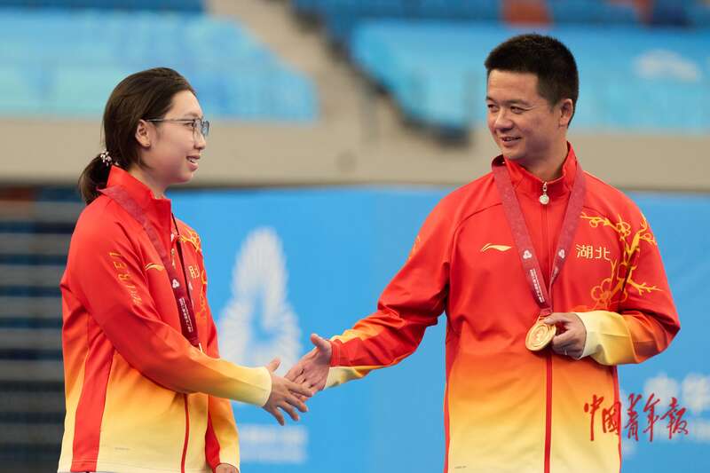 11月16日,广东深圳,深圳体育中心体育场,十五运会射箭女子反曲弓个人决赛颁奖仪式,冠军宗钰(左)与教练陈文圆握手庆祝。中青报·中青网记者 田嘉硕/摄