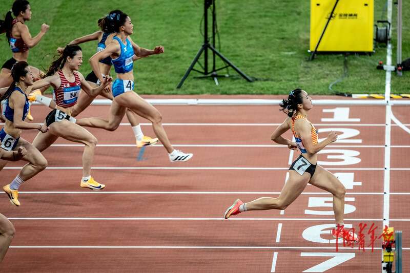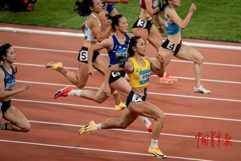 11月17日,广东广州,第十五届全国运动会田径女子100米复赛,福建队选手葛曼棋(黄)在比赛中,她以该组第一名的成绩进入了决赛。中青报·中青网记者 李隽辉/摄