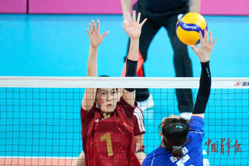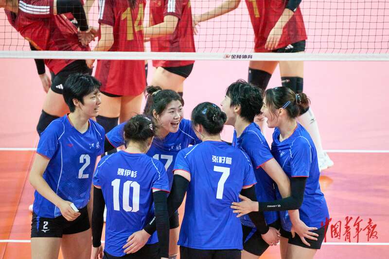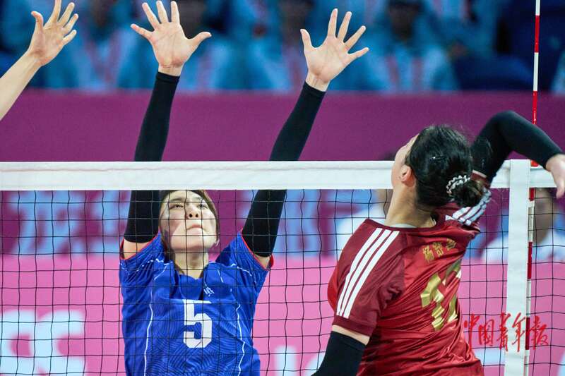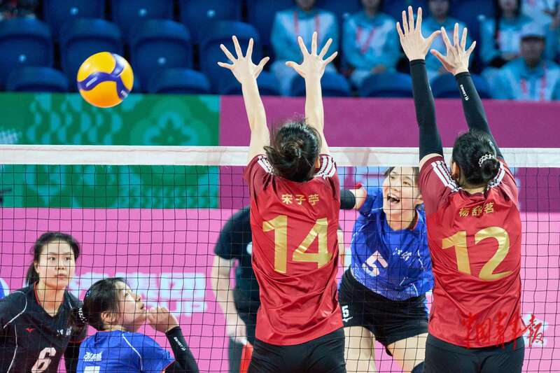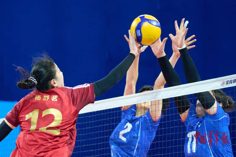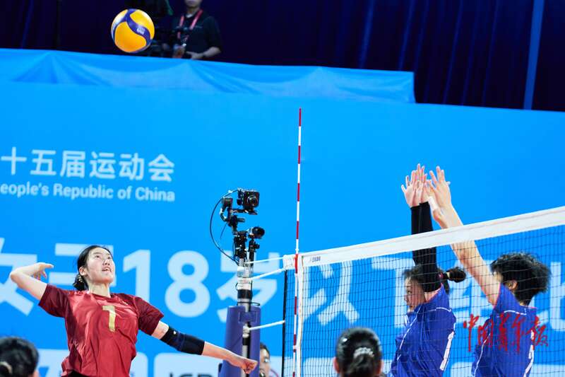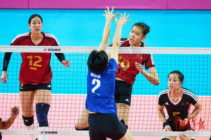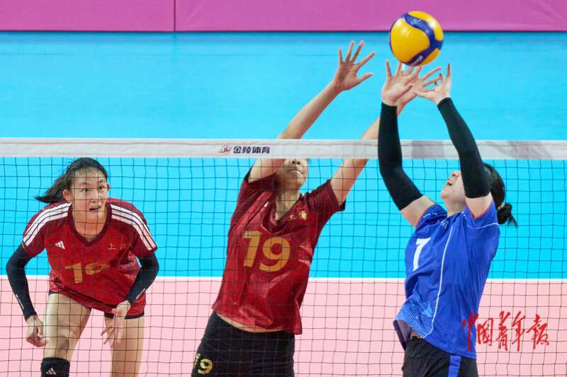 11月18日,广东深圳,深圳龙华文体中心,全运会排球女子18岁以下组冠亚军决赛,江苏队与上海队在比赛中。中青报·中青网记者 田嘉硕/摄