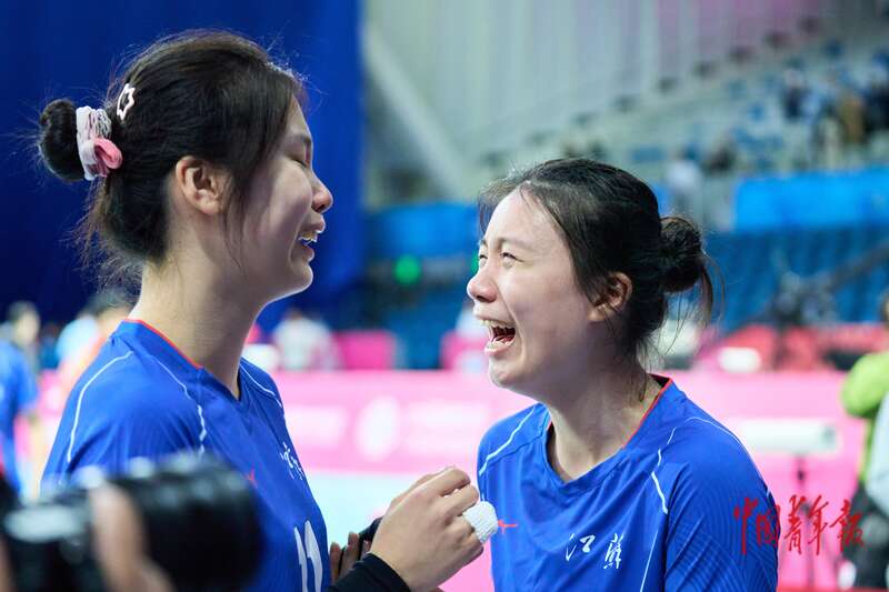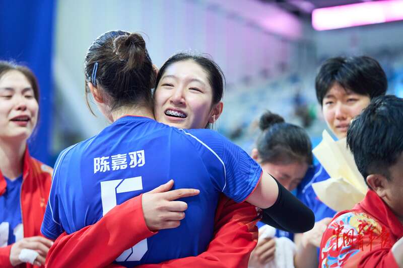 11月18日,广东深圳,深圳龙华文体中心,全运会排球女子18岁以下组冠亚军决赛后,江苏队队员常子鑫(左)与宣亚辰喜极而泣。在这场比赛中,江苏队直落三局,以大比分3:0战胜上海队夺得冠军。值得一提的是,在本届全运会排球女子18岁以下组系列赛,江苏队以一场未失、一局未丢的完美成绩,成就女排U18组别的“不败神话”。中青报·中青网记者 田嘉硕/摄