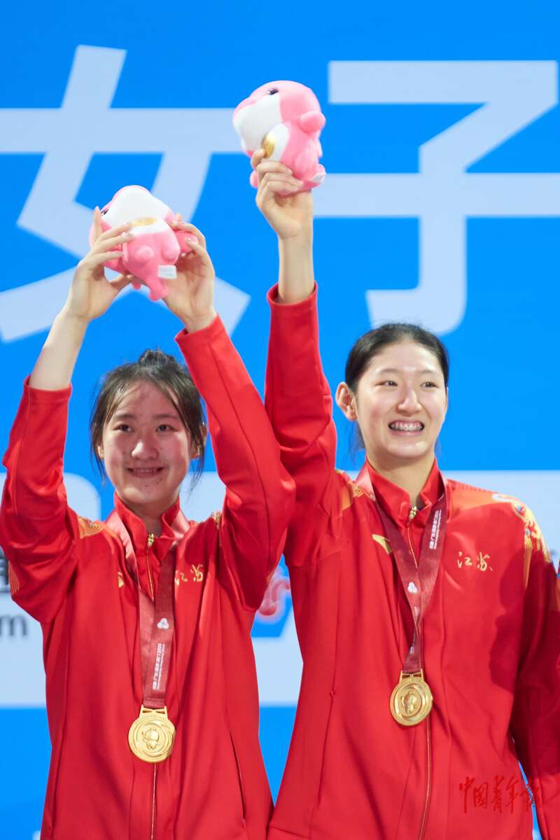 11月18日,广东深圳,深圳龙华文体中心,全运会排球女子18岁以下组颁奖仪式,江苏队队员韩欣宇(左)与施佳仪高举手中的全运会吉祥物庆祝胜利。中青报·中青网记者 田嘉硕/摄