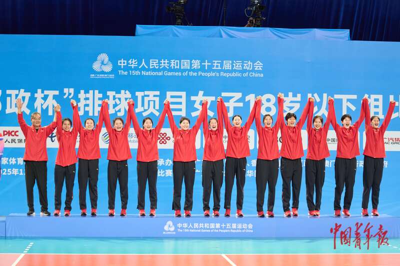 11月18日,广东深圳,深圳龙华文体中心,全运会排球女子18岁以下组颁奖仪式,江苏队队员及教练高举双手登上领奖台。中青报·中青网记者 田嘉硕/摄