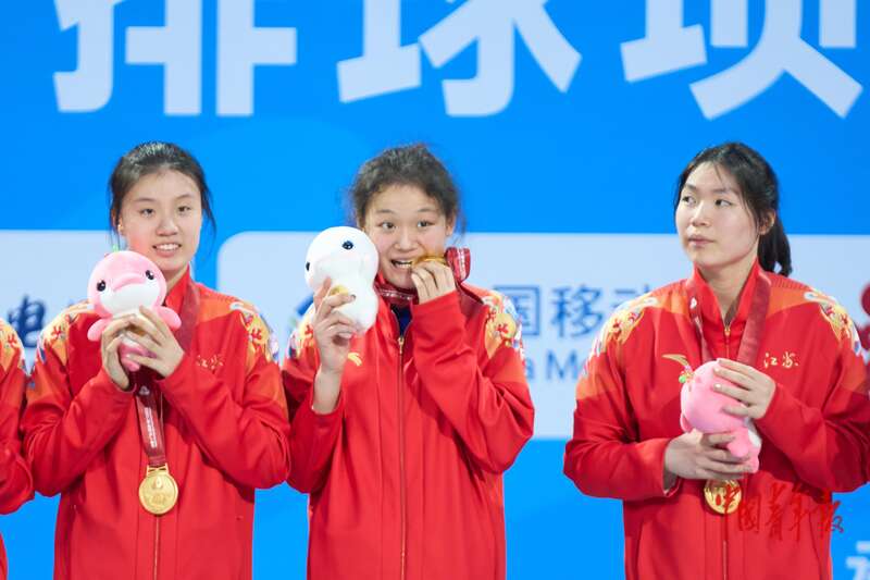 11月18日,广东深圳,深圳龙华文体中心,全运会排球女子18岁以下组颁奖仪式,江苏队队员魏伊杉(左二)咬金庆祝。中青报·中青网记者 田嘉硕/摄