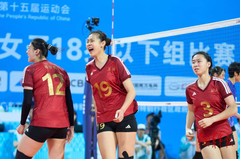 11月18日,广东深圳,深圳龙华文体中心,全运会排球女子18岁以下组冠亚军决赛,上海队队员在得分后呐喊。中青报·中青网记者 田嘉硕/摄