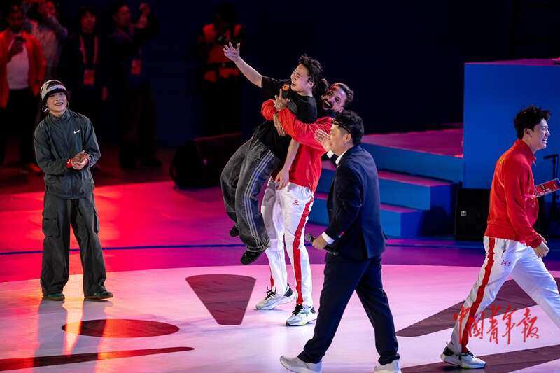 11月18日,广东广州,第十五届全国运动会霹雳舞女子组比赛,河南队刘清漪和教练在赛后庆祝。中青报·中青网记者 李隽辉/摄