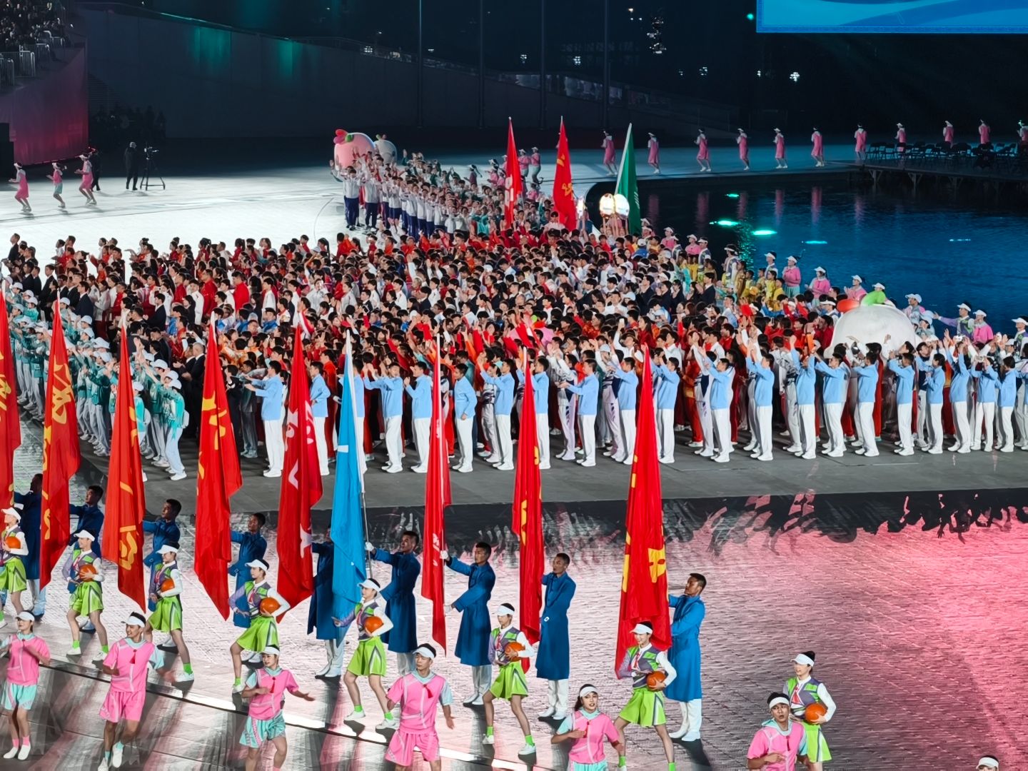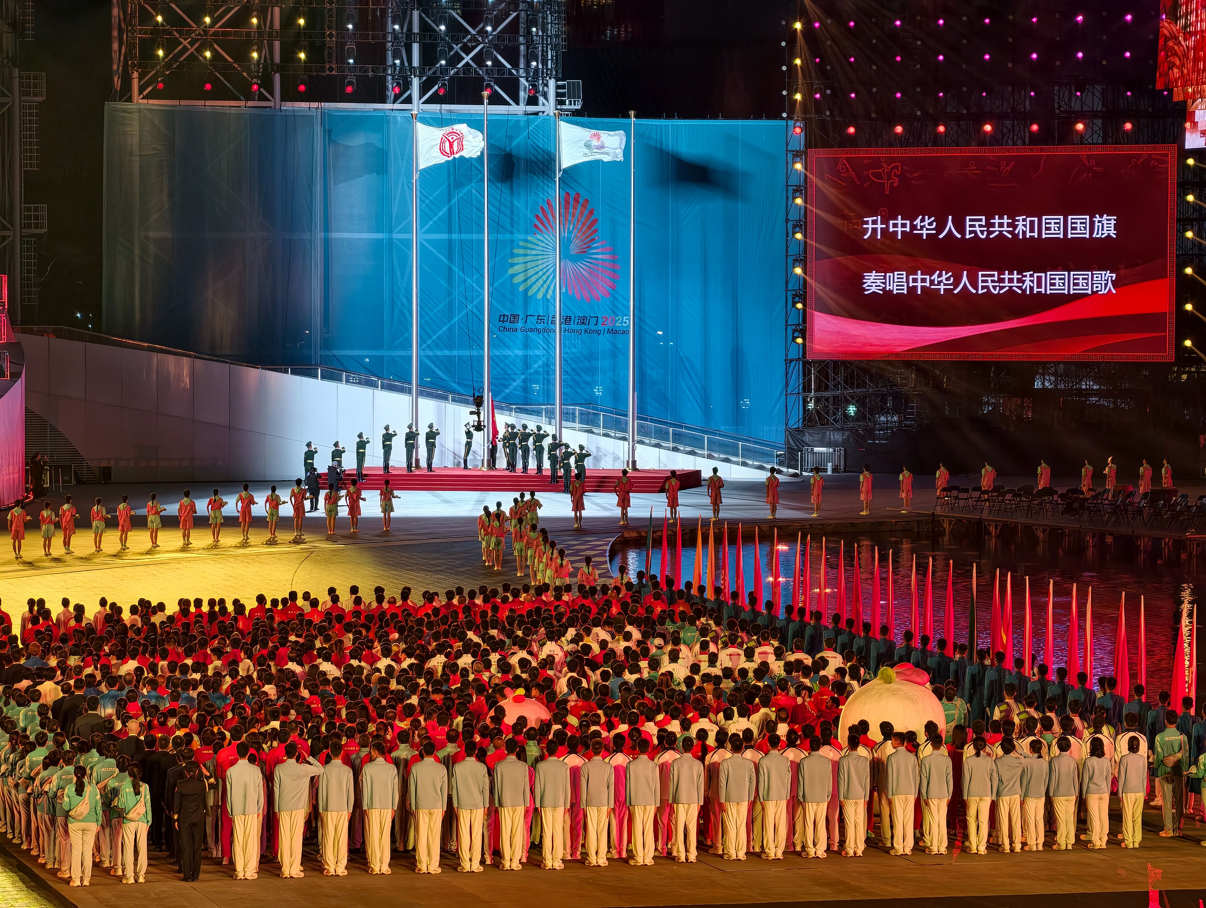 在运动员入场环节,不同省份的运动员自由“组队”一起走向舞台,组成了一个和谐的“运动员大家庭”,广东、香港、澳门三地运动员代表团再次同时入场,与开幕式的动人一幕相呼应。