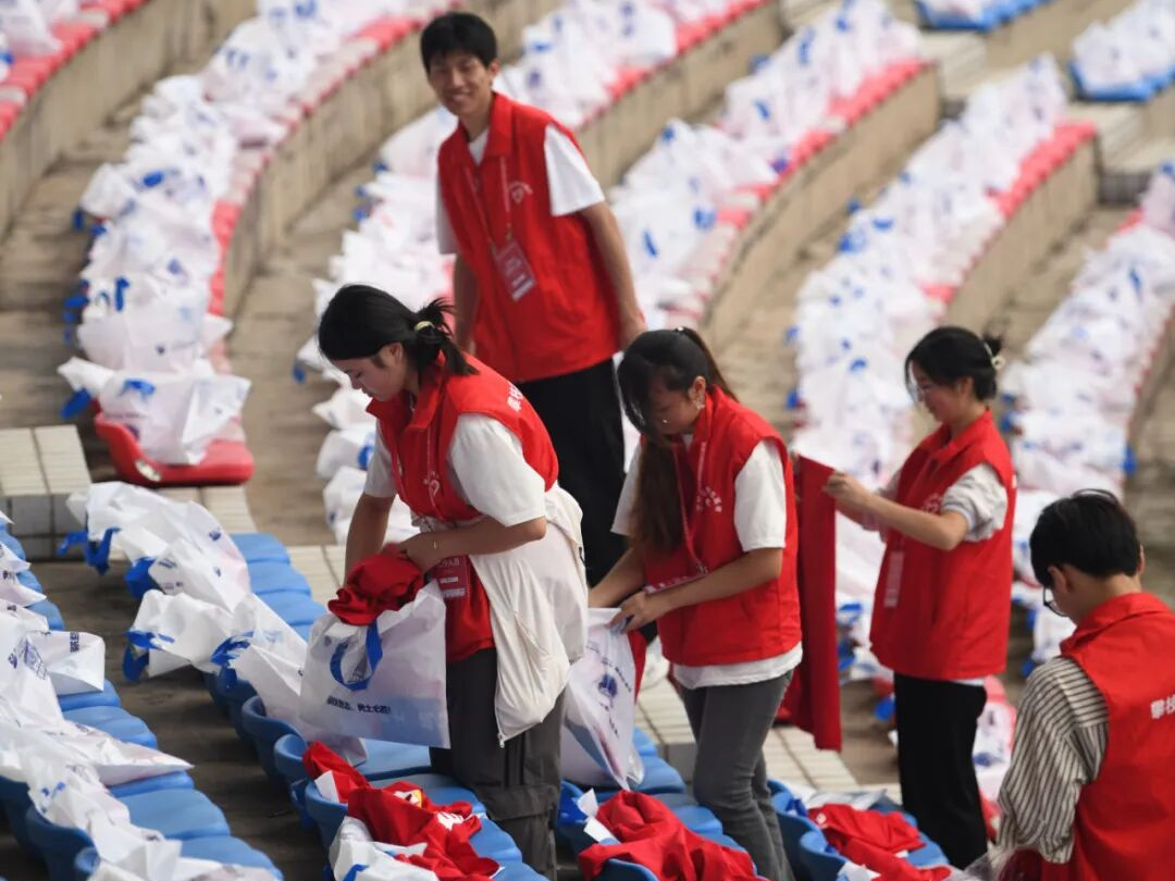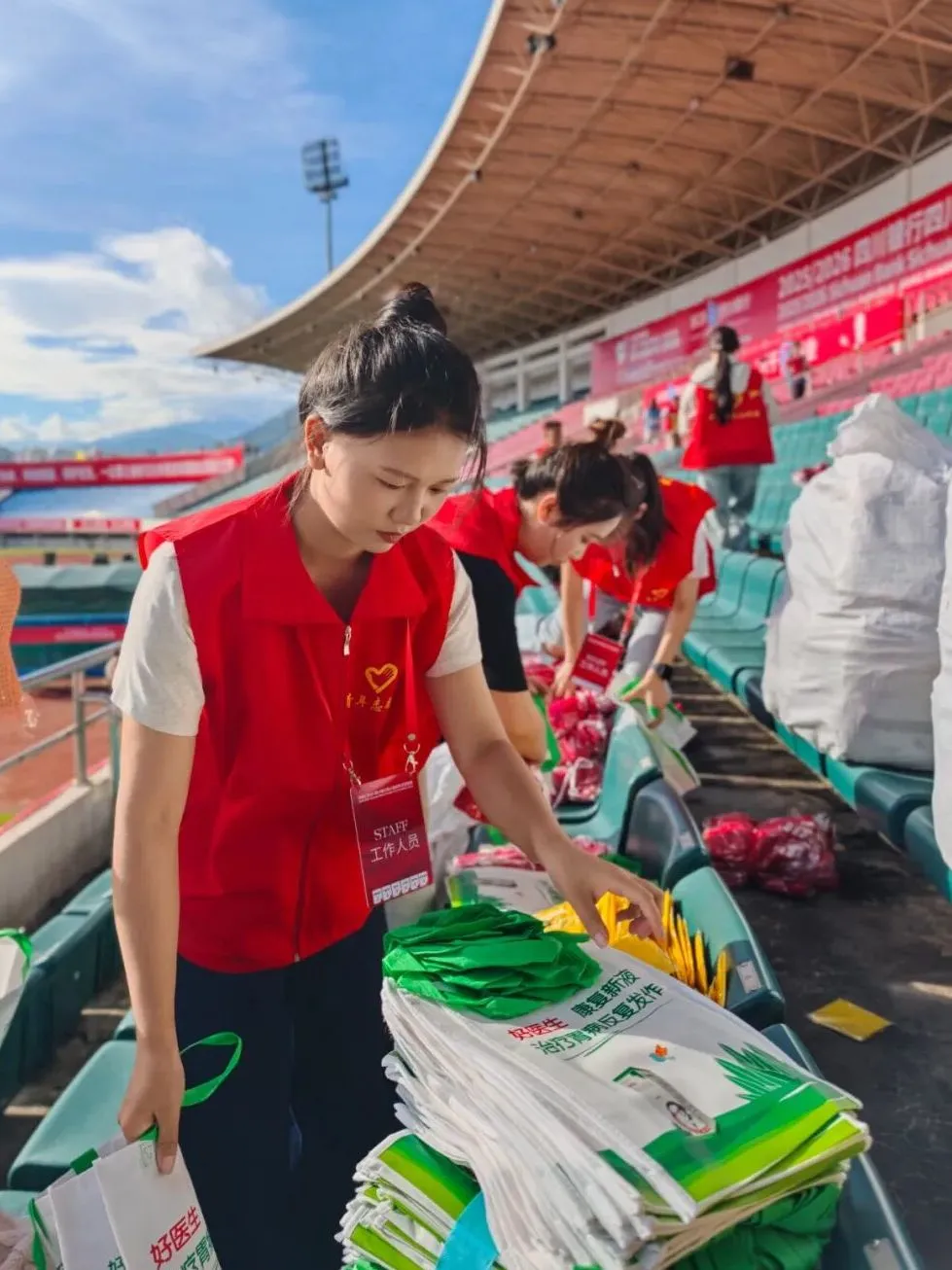 团攀枝花市委联合市融媒体中心组织114名青年志愿者助力川超。场外,检票口的志愿者引导观众有序入场;场内,志愿者们整齐摆放物资、为观众指引座位,在看台挥舞旗帜带动现场氛围。