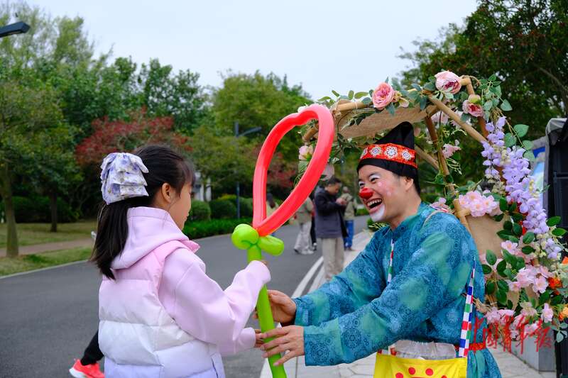 2月17日,广西南宁,南宁园博园景区内,小丑演员为游客赠送爱心花朵形状的气球。中青报·中青网记者 尹希宁/摄