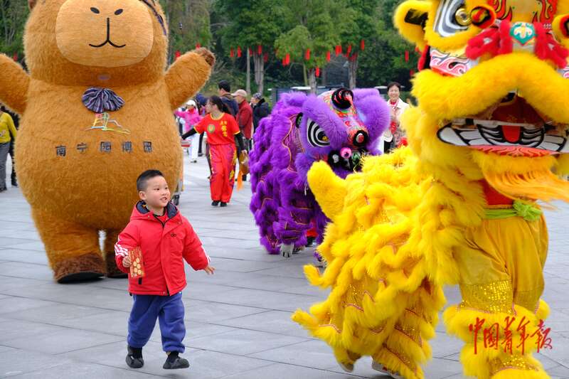 2月17日,广西南宁,南宁园博园景区内,舞狮表演吸引游客驻足欣赏。中青报·中青网记者 谢洋/摄
