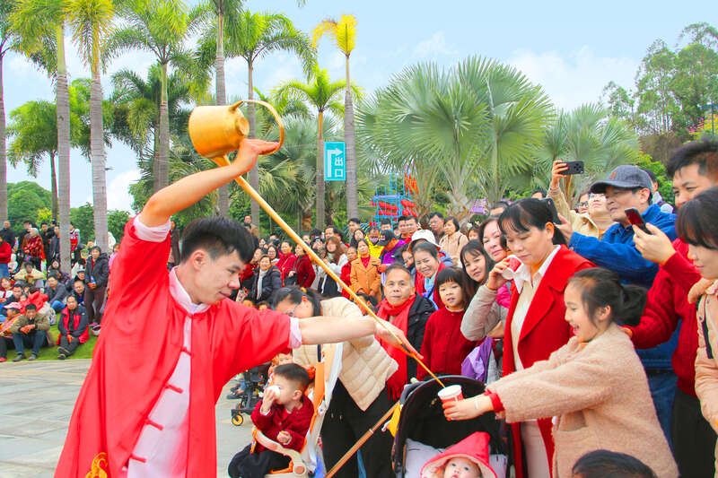 2月17日,广西南宁,南宁园博园景区内,民俗巡游队伍吸引众多游客驻足观看。正月初一至初七,南宁园博园打造一场集庙会闯关、民俗巡游、萌宠互动、烟花秀、浪漫花海、国风“飘雪”的新春盛会,助力市民度过一个欢乐祥和的春节。丘子阳/摄