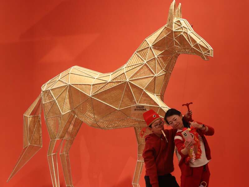 2月18日,北京,中国工艺美术馆(中国非物质文化遗产馆)举办“过年——丙午春节系列主题展”,游客与马合影。中青报·中青网记者 余冰玥/摄