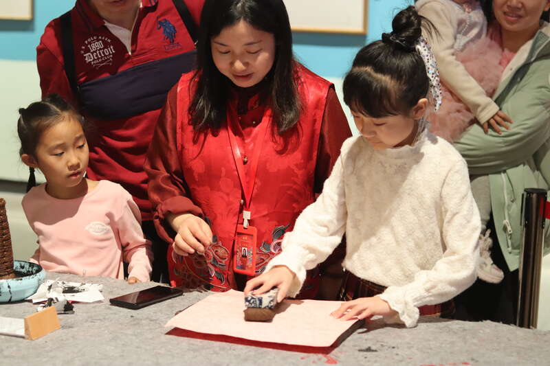 2月18日,北京,在中国工艺美术馆(中国非物质文化遗产馆),孩子们体验拓印。中青报·中青网记者 余冰玥/摄
