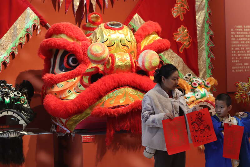 2月18日,北京,在中国工艺美术馆(中国非物质文化遗产馆)“气象万千——中国非遗保护实践主题展”,游客与广东醒狮合影。中青报·中青网记者 余冰玥/摄