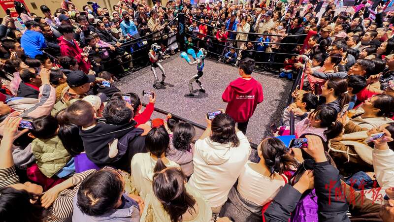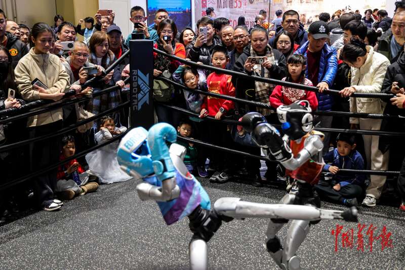 2月18日,北京,国家会议中心二期,2026大都新春庙会,人形机器人拳击比赛现场围满了观众,许多家长带着孩子一起来感受科技魅力。据介绍,该庙会聚焦“科技感、国际范、中国味”三大特色,融合科技、国潮、非遗等多重元素,让不同年龄段的市民和游客都能找到属于自己的新春乐趣。中青报·中青网记者 陈思阳/摄