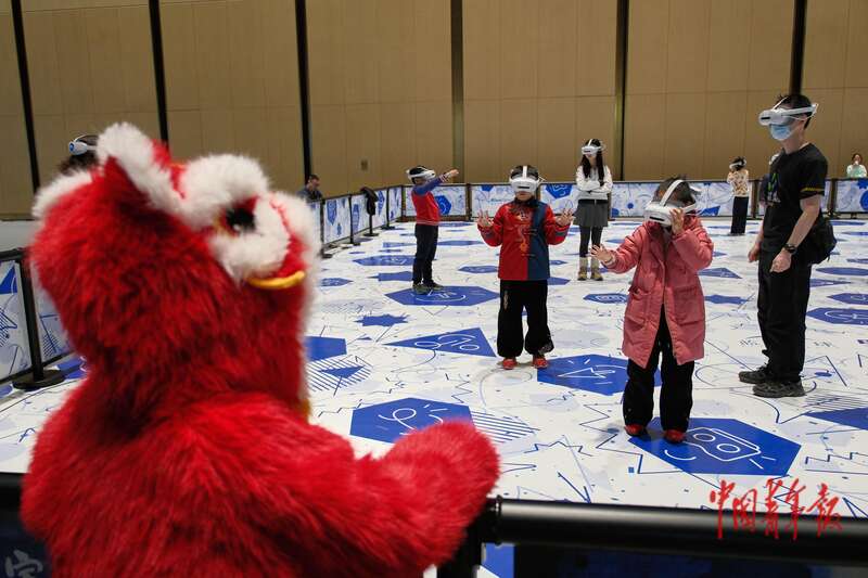 2月18日,北京,国家会议中心二期,2026大都新春庙会,一名身穿舞狮服饰的小朋友正在观看“MR”(混合现实)元宇宙体验项目。中青报·中青网记者 田嘉硕/摄