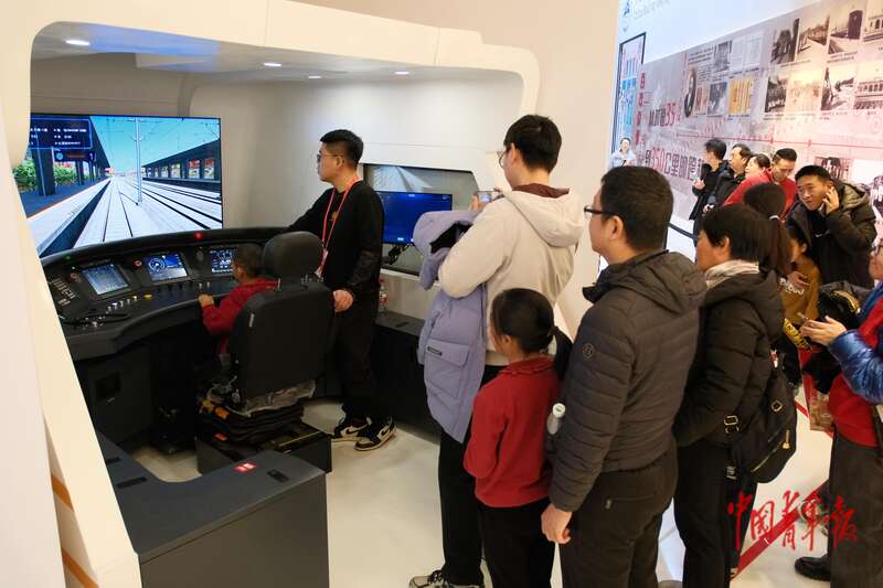 2月18日,北京,国家会议中心二期,2026大都新春庙会,人们正在排队体验“沉浸式”模拟驾驶复兴号动车组。中青报·中青网记者 田嘉硕/摄