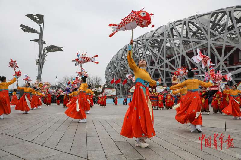 2月28日上午,北京中轴线玲珑塔旁的庆典广场,“非遗贺新春 民俗闹红火” 系列活动现场,浙江金华的鱼灯舞在国家体育场(鸟巢)前上演。中青报·中青网记者 孔斯琪/摄