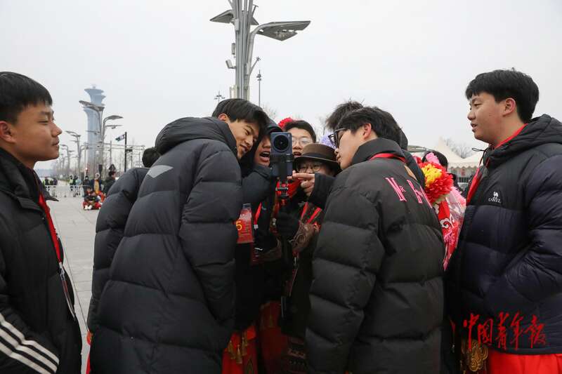 2月28日上午,北京中轴线玲珑塔旁的庆典广场,来自浦江职业技术学院的学生们在围观刚刚录制的视频。中青报·中青网记者 孔斯琪/摄