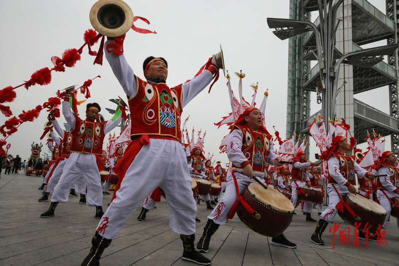 2月28日上午,北京中轴线玲珑塔旁的庆典广场,“非遗贺新春 民俗闹红火” 系列活动现场,演员们激情澎湃地表演陕西韩城天地社火。中青报·中青网记者 孔斯琪/摄