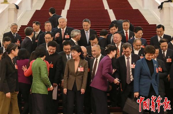 3月8日,北京人民大会堂,全国政协十四届四次会议第三次全体会议结束后,特别邀请人士界别的部分委员在合影后相互交谈。中青报·中青网记者 陈剑/摄
