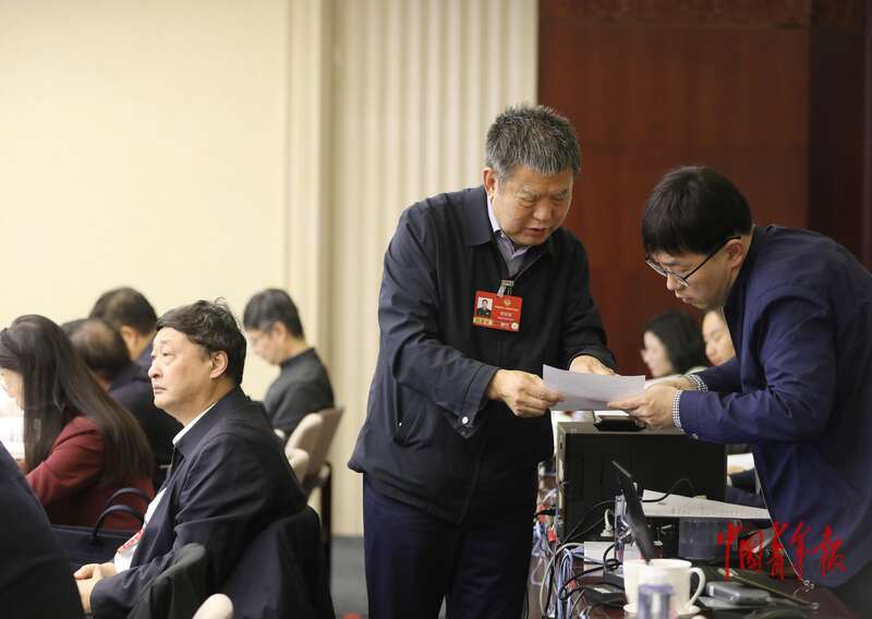 3月9日下午,北京会议中心,全国政协十四届四次会议科协界别小组会,全国政协委员、中国工程院院士樊邦奎(右二)和小组工作人员核对发言材料。中青报·中青网记者 陈剑/摄