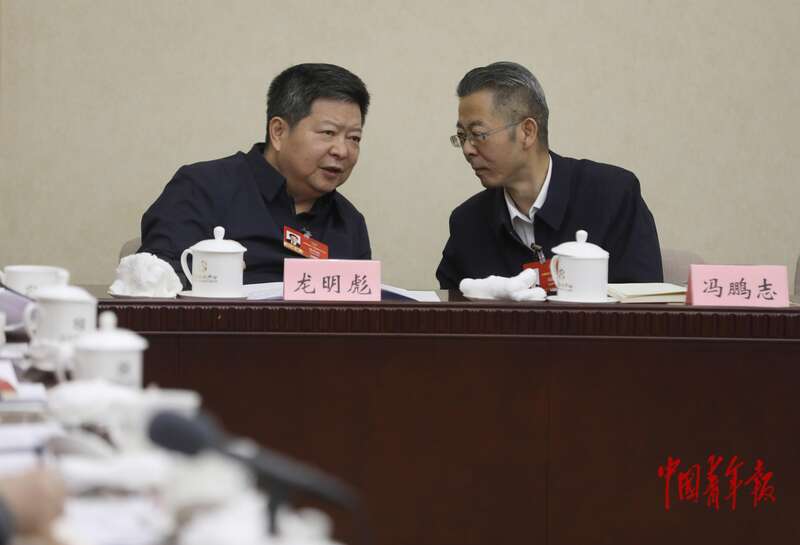 3月9日下午,北京会议中心,全国政协十四届四次会议社会科学界别小组会,全国政协委员龙明彪(左)和全国政协委员冯鹏志在交流。中青报·中青网记者 陈剑/摄