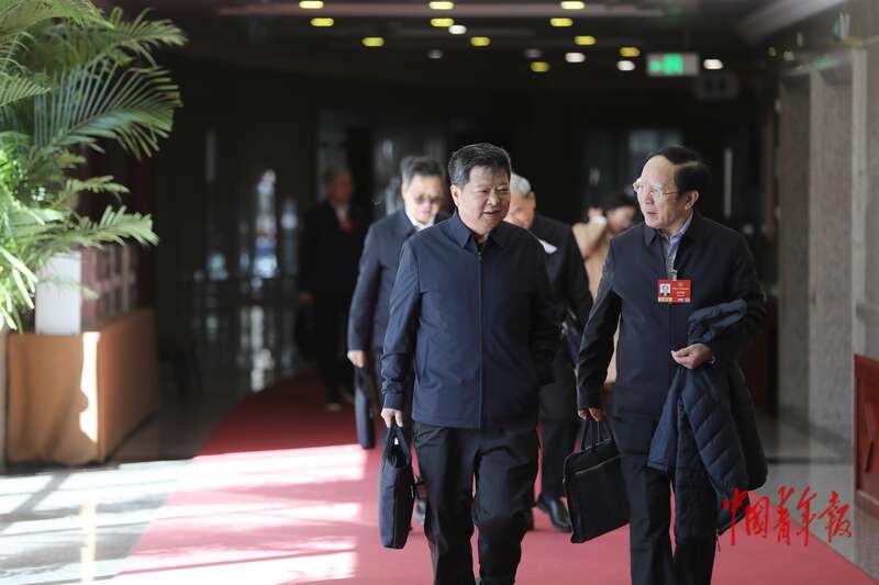 3月9日下午,北京会议中心,全国政协委员、山东大学儒学高等研究院院长王学典(右)和其他委员一起走向会场,准备参加小组会。当日下午,全国政协十四届四次会议各界别举行小组会议,讨论“两高”工作报告,审议各项决议和报告草案。中青报·中青网记者 陈剑/摄