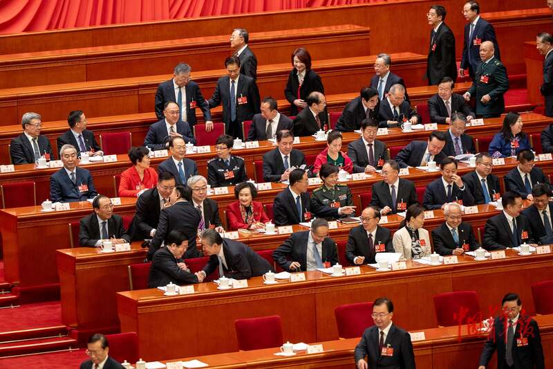 3月9日,北京,十四届全国人大四次会议第二次全体会议开始前,主席台上的代表落座、交流。中青报·中青网记者 李隽辉/摄