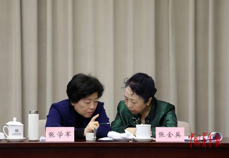 3月10日,北京会议中心,全国政协十四届四次会议民进界别小组会,全国政协委员张学军(左)与全国政协委员张金英交流。中青报·中青网记者 陈剑/摄