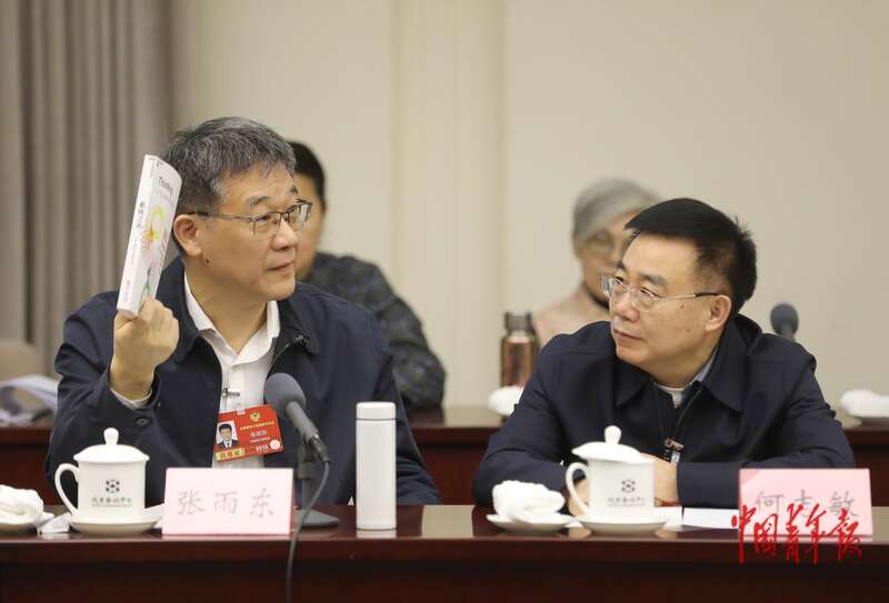 3月10日,北京会议中心,全国政协十四届四次会议民进界别小组会,全国政协委员、科学技术部原副部长张雨东(左)在发言中向各位委员推荐《系统之美》,这本书以各种真实的案例,阐述了系统思考如何应用于各种现实问题。中青报·中青网记者 陈剑/摄