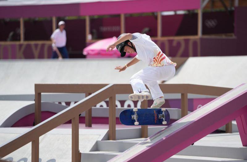 中国选手张鑫今天亮相奥运会历史上首个滑板女子碗池项目的赛场