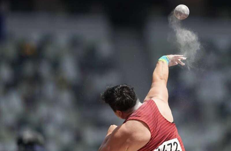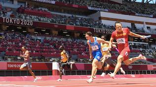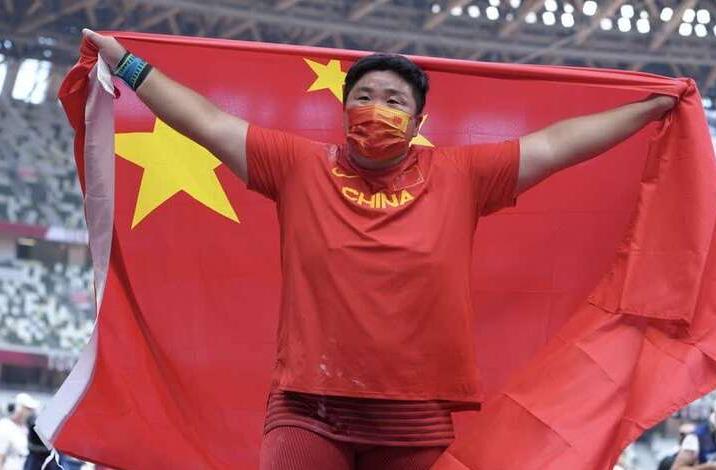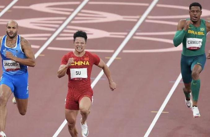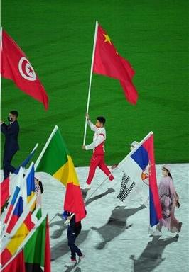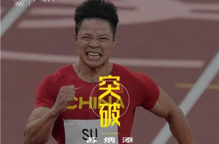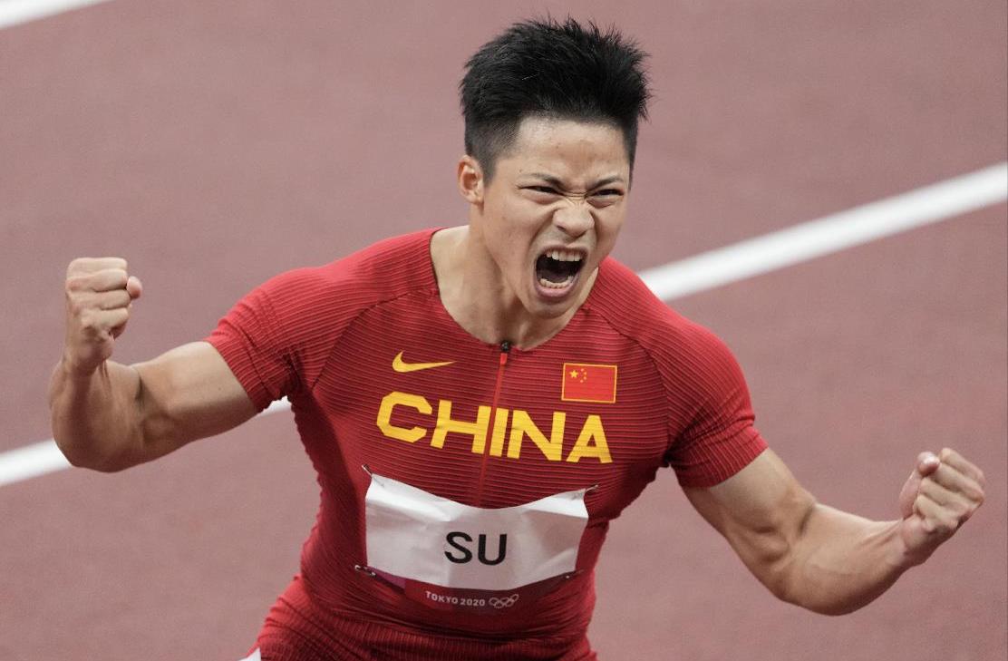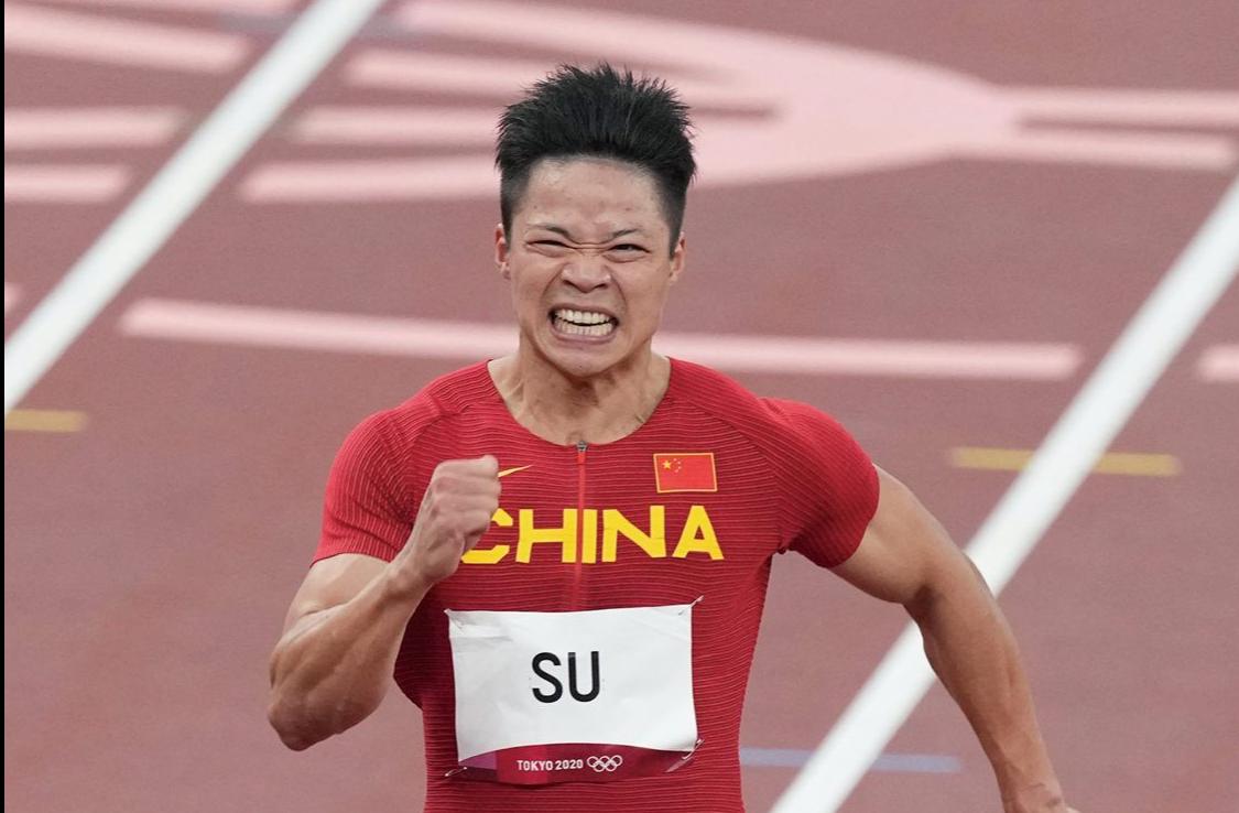 我国短跑名将苏炳添手执五星红旗高高飘扬