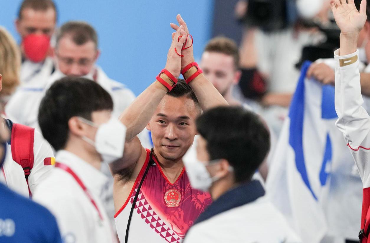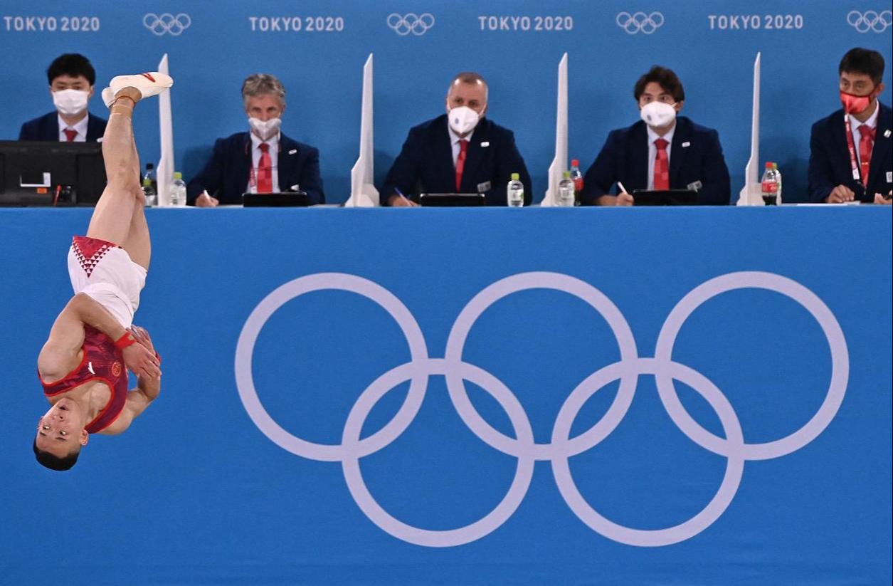 奥委会主席巴赫担当“礼仪先生”给冠军端放置金牌的托盘。
