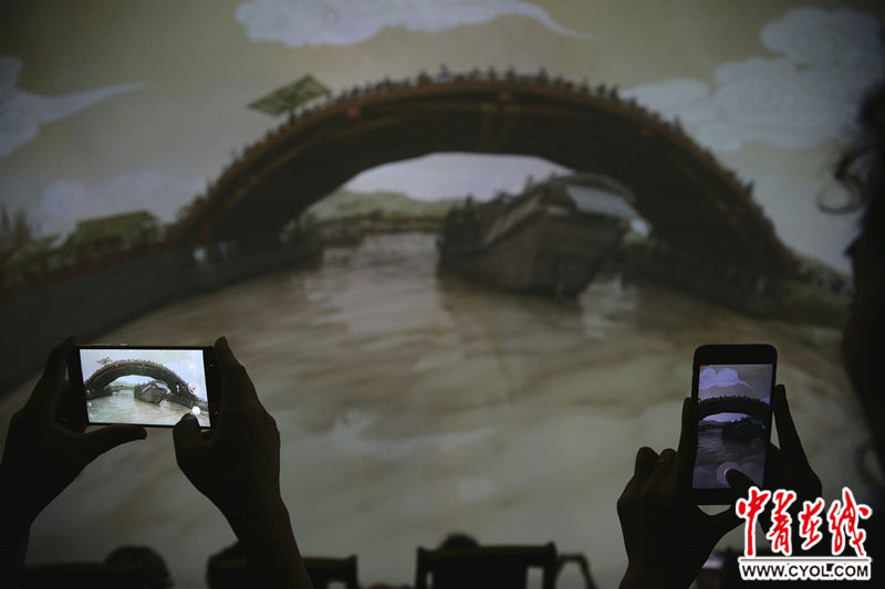5月18日,故宫博物院《清明上河图3.0》高科技艺术互动展演现场,观众在虹桥球幕影院,“坐”上一条大船,任河水划过脚下,柳枝拂面,感受汴河的繁忙,两岸的绮丽。