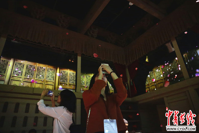 5月18日,故宫博物院《清明上河图3.0》高科技艺术互动展演现场,观众在孙羊店沉浸剧场感受桃花花瓣纷纷飘下。据介绍,该展演由故宫博物院与凤凰卫视联合打造。展馆位于故宫箭亭广场,约1600平米,共有《清明上河图》巨幅互动长卷、孙羊店沉浸剧场、虹桥球幕影院等三个展厅,以及一个宋人文空间,从各种维度最大化地营造观展的沉浸感和互动性。观众可以在各个音乐章节的串联中,以第一人称视角体验北宋都城汴京的众生百态,成为长卷中的人物,横渡船舶如织的汴河,并在宋代的人文雅韵中唤醒文化的记忆。