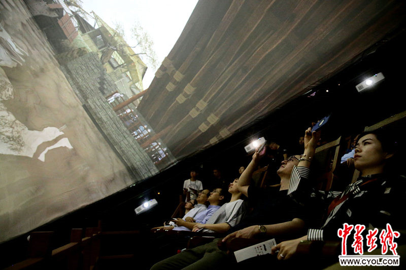 5月18日,故宫博物院《清明上河图3.0》高科技艺术互动展演现场,观众在虹桥球幕影院,“坐”上一条大船,任河水划过脚下,柳枝拂面,感受汴河的繁忙,两岸的绮丽。