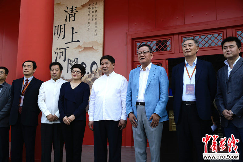 5月18日,故宫博物院《清明上河图3.0》高科技艺术互动展演开幕式上,故宫博物院院长单霁翔、凤凰卫视董事局主席行政总裁刘长乐等嘉宾合影留念。