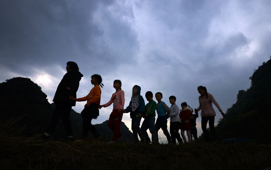 3月13日,欧肇林和女儿冯芳带着孩子们行走在山地间。她们是湘桂边界深山里的江永县桃川镇大地坪村岩寺营小学的教师。这对母女在这所山区小学分别默默坚守了26年和22年。“我最大的愿望是把学校办下去,让孩子们在家门口读好书。”冯芳说。视觉中国供图