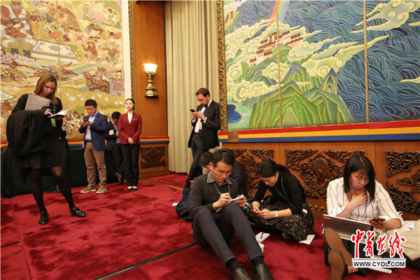 3月6日下午,北京人民大会堂西藏厅,西藏自治区代表团开放团组会议。会场内记者很多,一些记者席地而坐,边听会边写稿。