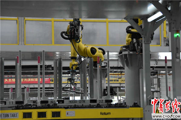 北京现代沧州分公司生产车间的焊接机器人正在作业。中青在线见习记者曾宪旭 摄