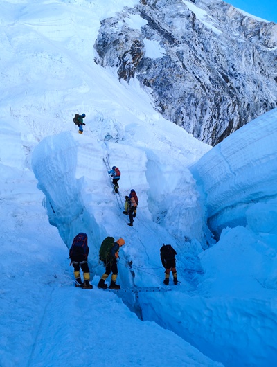 山上的“路”由“冰川医生”夏尔巴人建设和维护,他们将绳端用冰锥固定进千年岩冰,连接起破碎凌乱的昆布冰川,让登山的人能够通过珠峰南坡攀登线路中这段最危险的路线。
