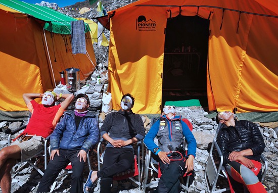 珠峰大本营,队员贴面膜休息。何玉龙/供图