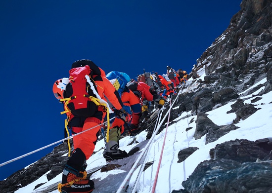 海拔8790米的希拉里台阶上,穿着醒目颜色羽绒服的人排起了长队,一面是万丈悬崖,一面是一个冰岩石结合的断面,断面之外又是悬崖。