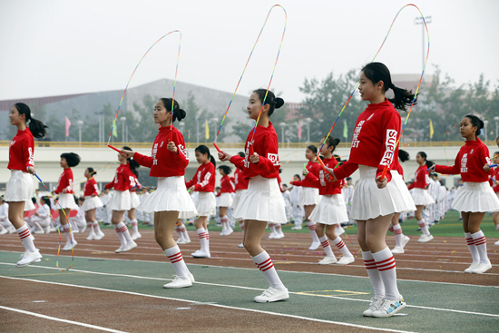 北京市东城区崇文小学“锻炼体质追逐梦想”亲情体育节在北京经济技术开发区体育中心举行。图为小学生在展示花样跳绳。新华社发(资料图片)