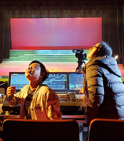 2020年援藏,朱丹(右)和旦增(左)在《次仁拉姆》灯光对光编程现场。